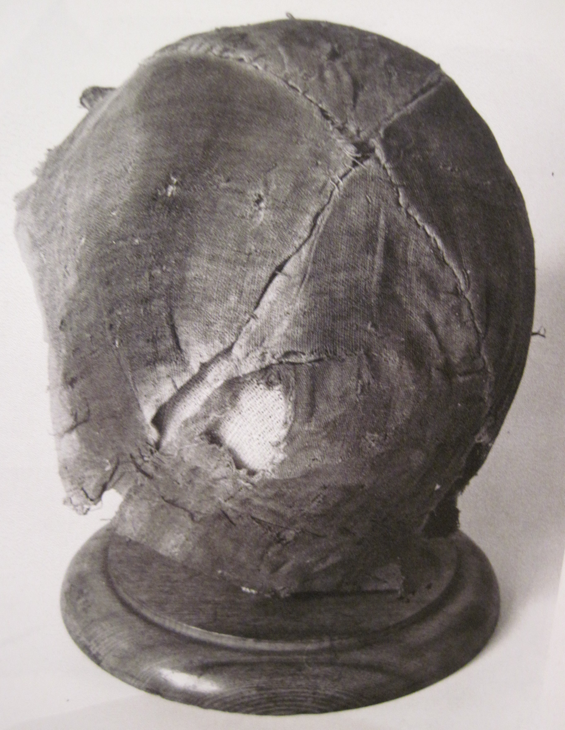 Rund, aus vier Zwickeln zusammengesetzt; vorne Reste einer Pelzverbrämung; Leinwand mit Pelzfutterresten an der Innenseite. Die jeweils paarweise vereinigten Zwickel ergeben unten am Kappenrand eine gebrochen Linie.